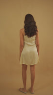 In a subtle tangerine hue, this slip dress is a simple and elegant piece. The fabric glides over the skin with a smooth drape, creating a beautiful silhouette. It is a comfortable and stylish choice for both quiet evenings and special occasions.